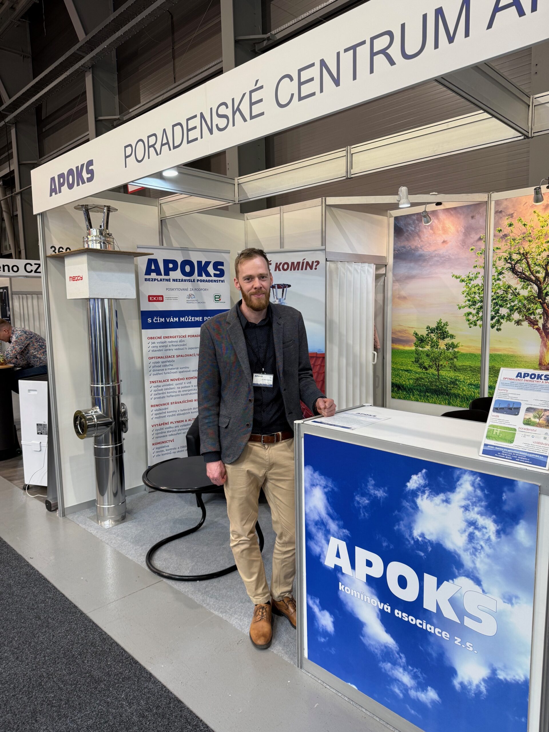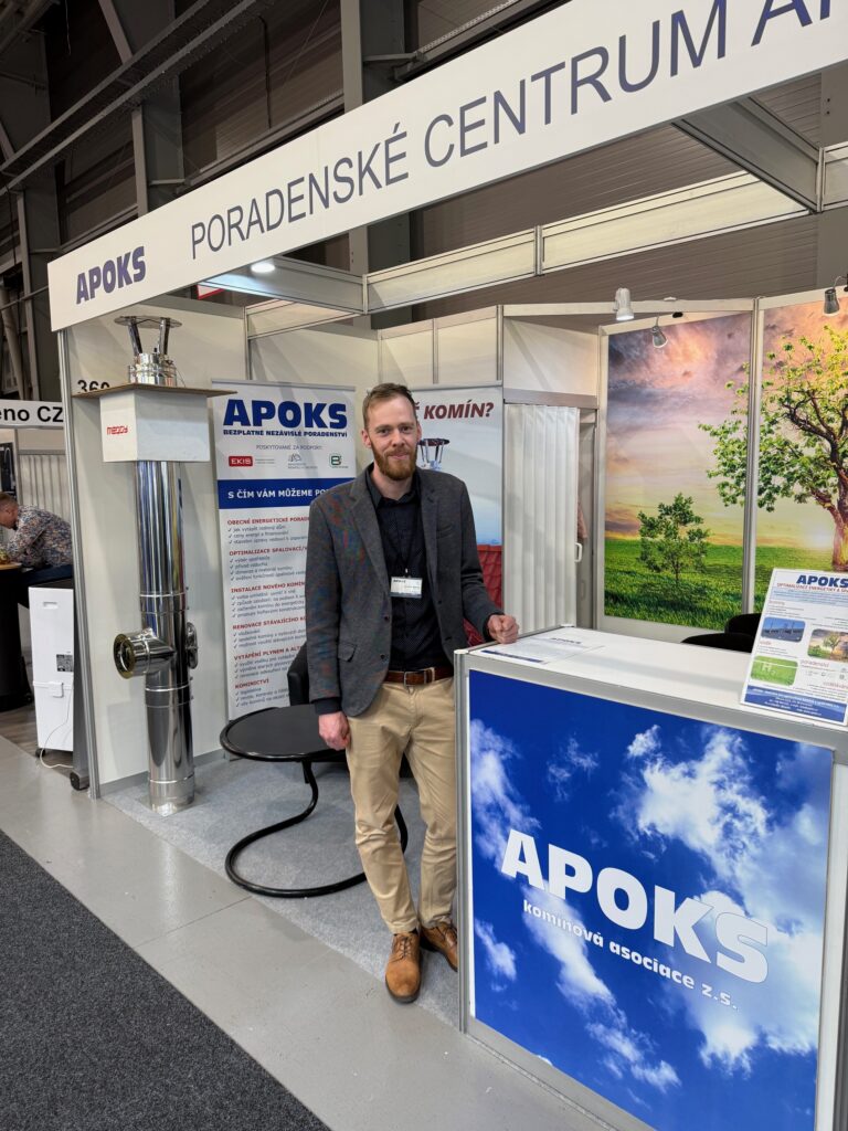 Na výstavě pak probíhaly jako obvykle po všechny dny přednášky a doprovodné programy a svůj velký stánek tam měl především Cech topenářů a instalatérů a Komínářská asociace APOKS, kde radil zájemcům (včetně mne) jak zefektivnit provoz spalinových cest a zajistit jejich bezpečnost přímo její předseda Walter Sodomka (foto Komínářská asociace).