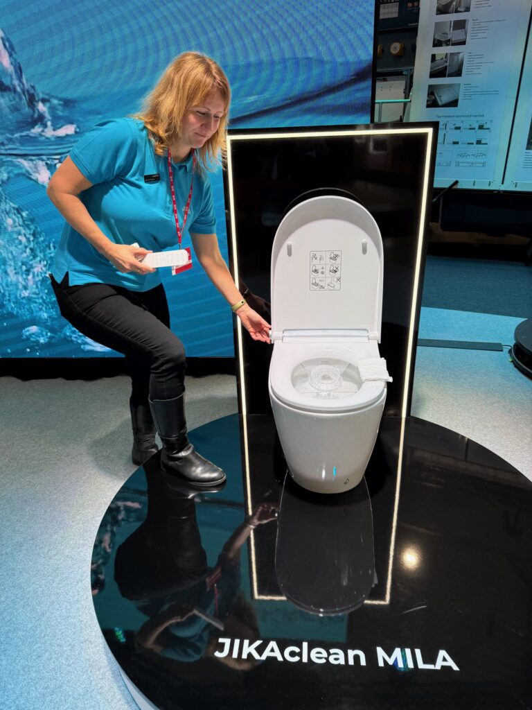 Pro jistotu jsem se proto na výstavě podíval přes uličku na expozici konkurenční české firmy JIKA, která je součástí známé nadnárodní skupiny LAUFEN. A přišel příjemný šok – ta vystavovala své obdobné WC JIKACLEAN MILA, které je již skoro rok v prodeji, s totožnými funkcemi (bezokrajové splachování, dvojí splachování, anální a dámská sprška s oscilací a pulzací v 5 úrovních, UV dezinfekce, vysoušení, vyhřívané sedátko, odsávání zápachu, noční osvětlení mísy a dálkové ovládání a další)za pouhých 21 727 Kč (bez DPH). Jasně, že tam byl nával! A co více, hned vedle vystavovala JIKA prototyp obdobné WC mísy, která oproti předešlé se lišila zásadně jen tím, že nebyla závěsná (tedy nevyžadovala ocelový podomítkový modul s nádržkou a ovládacími tlačítky, všechny ostatní funkce byly shodné), ale kvůli vestavěné nádržce spočívala na podlaze (foto Novinka JIKA).A bude dokonce levnější než ta závěsná (27 550 Kč bez DPH, ale ušetří se cca 4 000 Kč za drahý podomítkový modul s tlačítky a další tisíce za práci na jeho zabudování do zdi) a její výroba začne již začátkem dubna 2026. Zkrátka bezkonkurenční WC pro rekonstrukce jako náhrada stávajících běžných kombi WC mís (a současně i bidetu), pokud nechceme sbíječkou mlátit do zdi či do ní vrtat a sekat a lámat dlaždičky.
