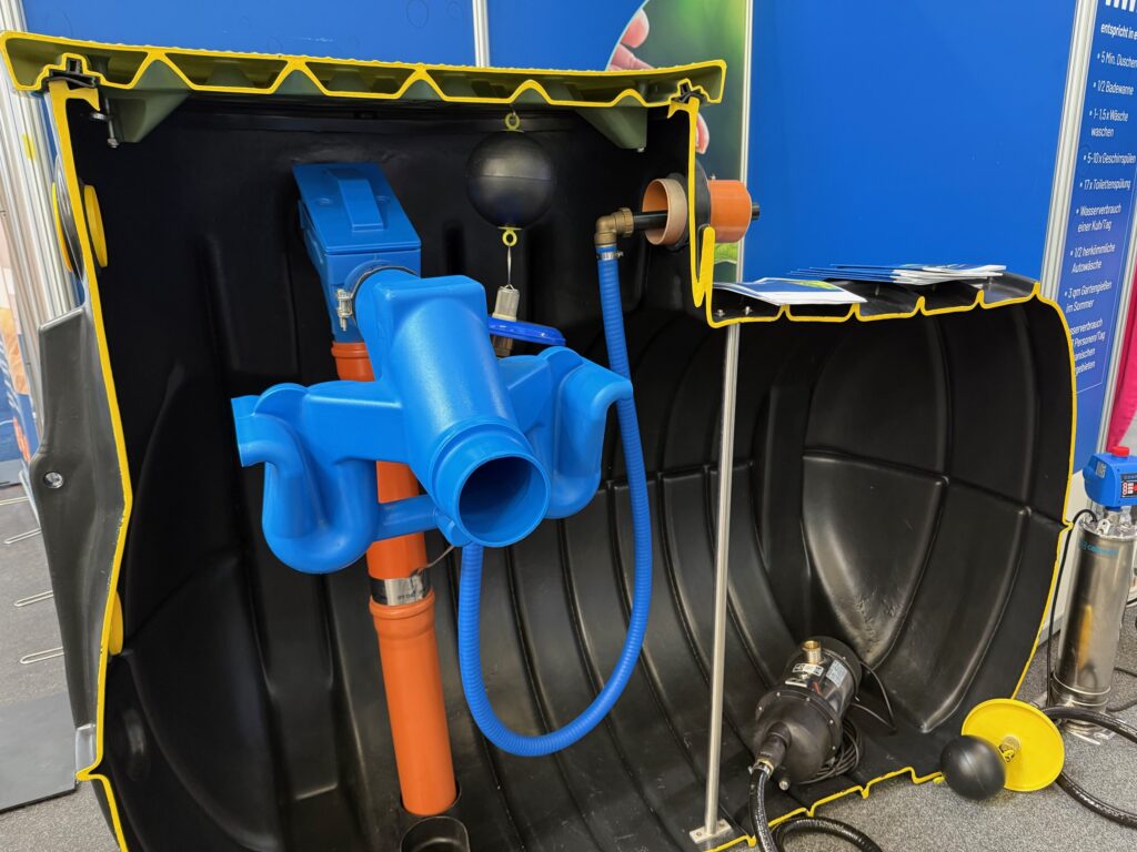 U zásobníků vody konečně jejich výrobci uznali, že je lepší mít kvůli regulaci více teplotních čidel a v tom případě ne v jímkách ve vodě, ale vně kovového pláště v liště – já jsem si to tak udělal doma už dávno a funguje to. Ale novinkou byly elektrické topné tyče do bojlerů, které na té venkovní části místo elektrických svorek měly krabičky s velkým barevným grafickým displejem k jejich elektronickému řízení s možností dálkového ovládání. Super! Já je doma léta řídím levnými mechanickými relátky z Číny s jen dvoubarevným numerickým displejem, ale ta kvalita to samozřejmě není (ale cena naštěstí také ne). A pokud chceme používat dešťovou vodu, kterou musíme u novostaveb již povinně jímat a využívat i u nás, tak je třeba ji pečlivě přefiltrovat, jinak ucpe trysky (foto Filtry dešťové vody), což se u nás často neděje.  A konečně tam už nastal ústup od vířivek, zatím alespoň těch malých – samozřejmě kam jinam, než k těm ještě větším až obrovským pro celou rotu .